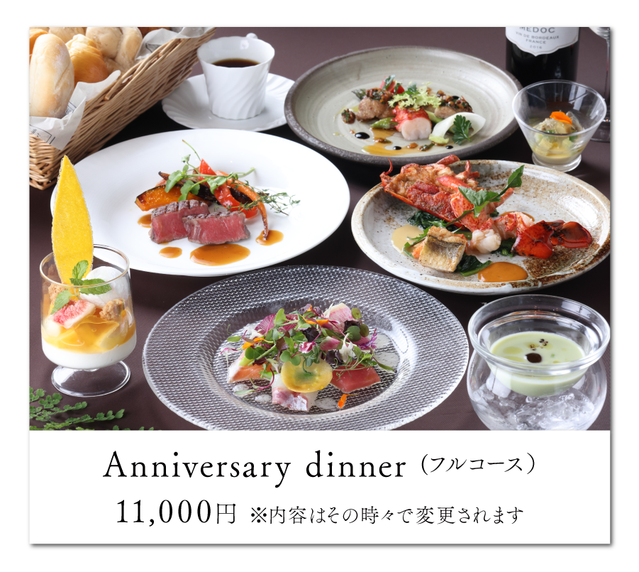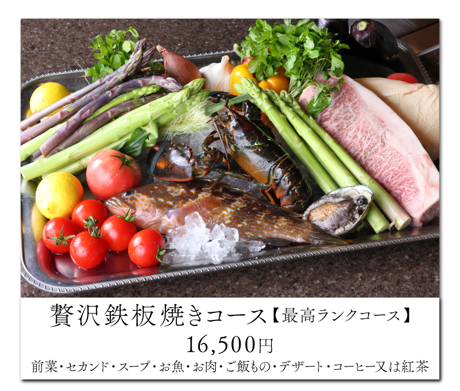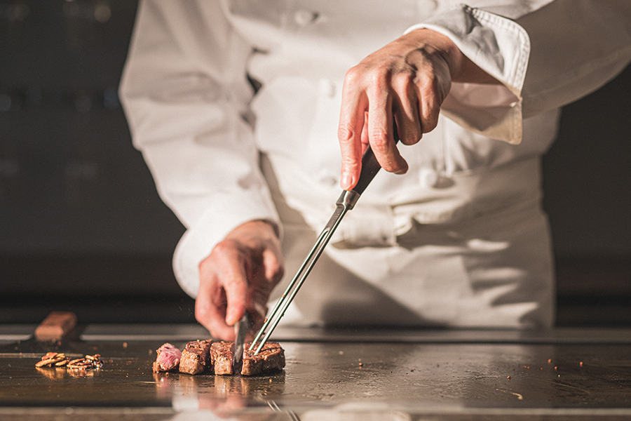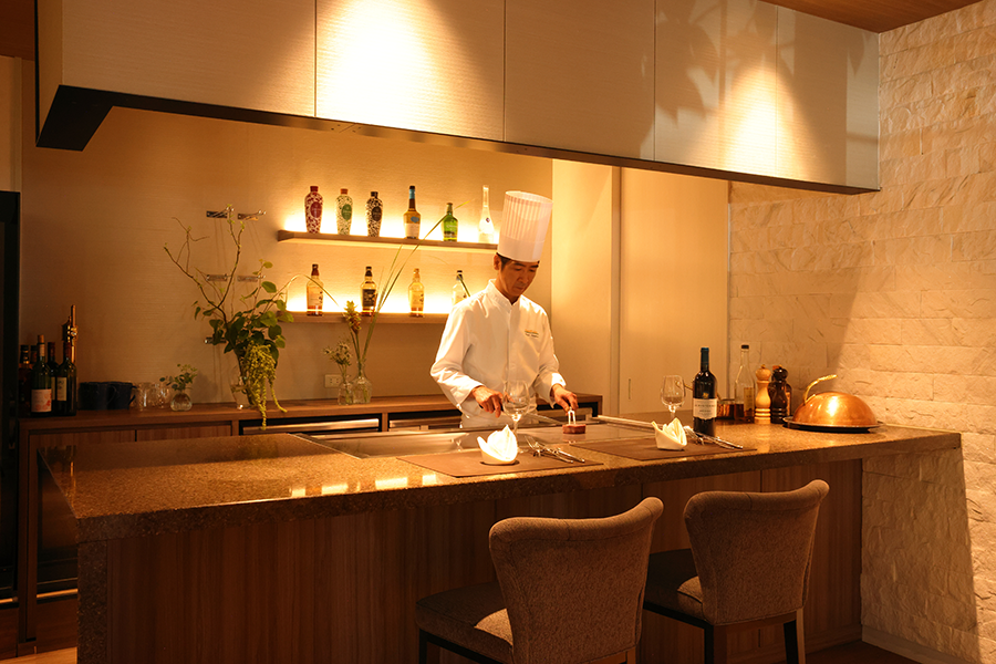 厳選したA5ランク黒毛和牛やフォアグラなど、冷たい前菜以外はほぼ全てを目の前で焼き上げる、五感で堪能する鉄板ディナー。デザートにはメッセージも添えられ、大切な日を特別に彩ります。3日前までの予約制です。